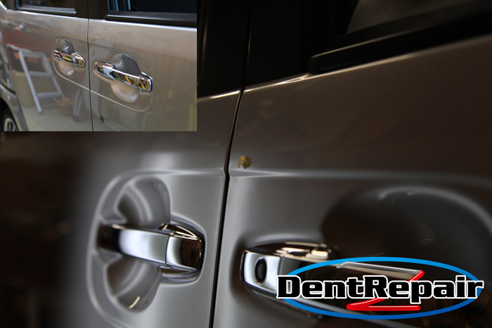 写真は運転席ドアのアウターハンドル近くに出来た深いへこみ、衝撃点が2つあります。