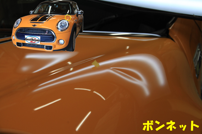 今日のデントリペアのご紹介は、ミニクーパーSのボンネットに出来た深いへこみの修理です。