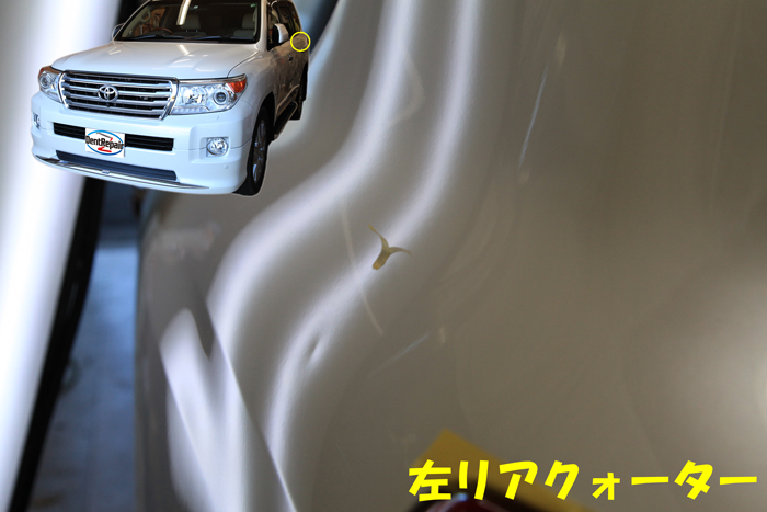 今日のデントリペアのご紹介は、トヨタ・ランドクルーザーの左リアクォーターに出来たへこみの修理です。