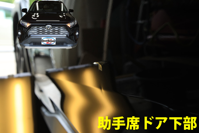 今日のデントリペアのご紹介は、トヨタ・ラブ4の助手席ドア下部のプレスライン部に出来たへこみの修理です。